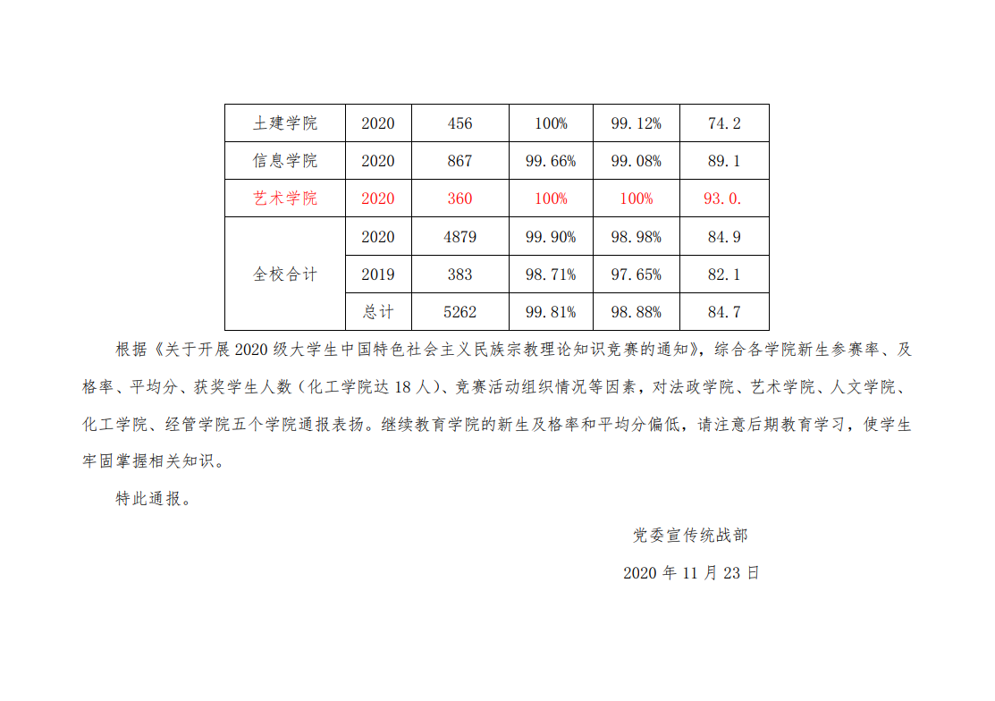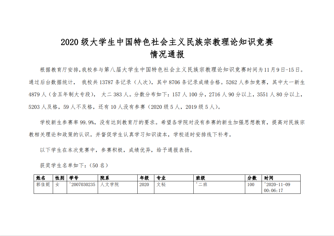 2020級大學生中國特色社會主義民族宗教理論知識競賽情況通報