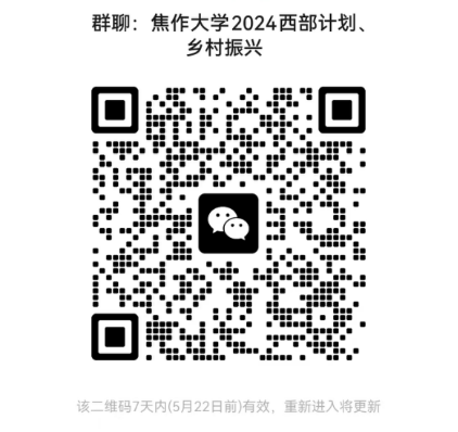 焦作大學志愿服務西部計劃和鄉(xiāng)村振興計劃項目辦設在校團委。有意向報名的同學可掃描后附二維碼進入“焦作大學2024西部計劃、鄉(xiāng)村振興”微信群。如有其它疑問,請咨詢校團委西部計劃負責人。