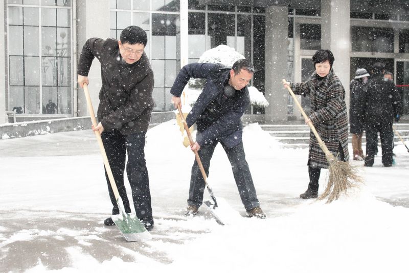 “幸福都是奮斗出來的”。經過一個多小時的奮戰,大家終于將辦公樓前主要入口、主干道等地的積雪鏟除,為師生員工開辟了一條通暢之路。雖然大家的頭發、衣服、鞋子都弄濕了,也出了一身的汗,可看著眼前通暢干凈的道路,大家都很有成就感,每個人的臉上都洋溢著開心的笑容。