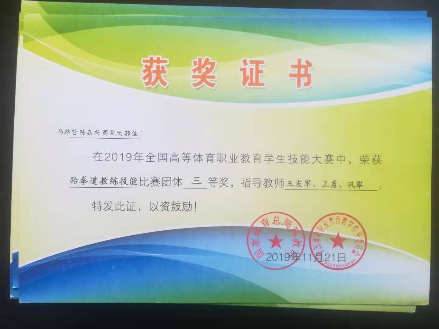 我校派出了由太極武術學院鞏攀、王勇、王友軍為指導教師,太極武術學院周榮欣、郭嘉、馬路營、陳嘉興4名學生為隊員的代表團參加了本次比賽。在本屆大賽中,我校參賽選手全力以赴、頑強拼搏。面對來自全國18所省級體育職業學院的參賽強手(絕大多數選手為省隊隊員),不畏懼、不退縮,展示出了自身的職業素質和技能水平,并與其他學校深入交流學習,共同提高。經過個人技能、教學輔導以及項目推介三項比拼,我校參賽四名隊員共獲得1個二等獎和3個三等獎的好成績,并榮獲體育道德風尚獎。學校、學院領導高度重視本次大賽,在隊伍選拔、校內訓練及比賽過程,都給予了關注和鼓勵。學生們通過比賽增長了見識,收獲了友誼,看到了成績,發現了不足,對今后的學習發展充滿了自信和信心,指導老師們通過比賽,開拓了視野,打開了思路,增長了教學心得,為今后的教學和訓練積累了豐厚的經驗。