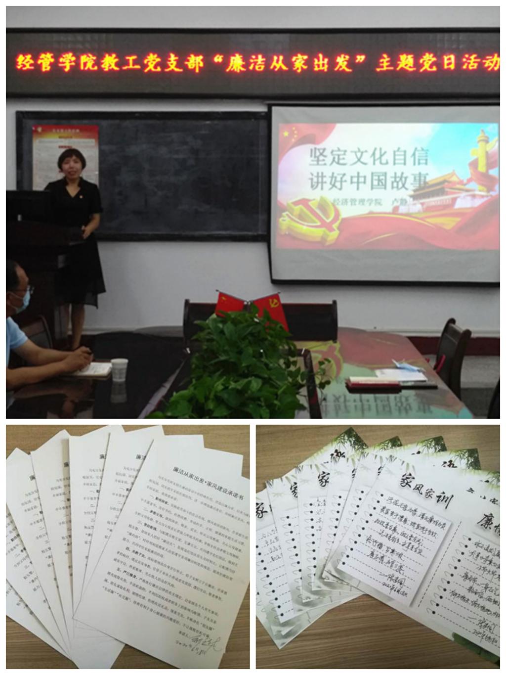 本次黨日活動主題為“廉潔從家出發,弘揚廉潔家風”,活動分為四個部分進行,一是加強學習,樹立廉潔家風。經管學院教工黨支部將習近平總書記對廉潔家風的重要論述、黨內法規關于家風之規定摘編成冊,發放給支部黨員學習,并現場觀看《樹廉潔家風,創幸福家庭》公益沙畫視頻;二是堅定文化自信,講好中國故事。由盧靜同志講述“兩彈一星”獎章獲得者郭永懷及夫人李佩的廉潔故事,傳承廉潔家風;三是現場發放了《征集卡》,向支部黨員征集家風家訓和廉情寄語;四是組織黨員簽訂《廉潔從家出發?家風建設承諾書》,我們倡議每位黨員做如下承諾:勤儉持家、孝敬父母、管好配偶、關教子女、嚴己修身。