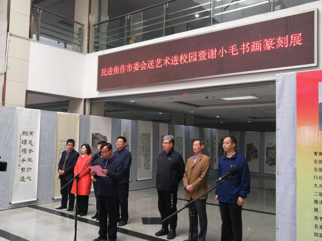 翰墨丹青千古事,神游盡在書畫中。2020年10月20日,“民進(jìn)焦作市委會(huì)送藝術(shù)進(jìn)校園暨謝小毛書畫篆刻展”走進(jìn)焦作大學(xué)。上午9點(diǎn),開幕式在南校區(qū)圖書館大廳舉行。市人大常委會(huì)副主任、民進(jìn)焦作市委主委喬學(xué)達(dá)、校黨委書記魏曰高、校黨委副書記、工會(huì)主席符德學(xué)、市文聯(lián)黨組書記龐宏、市委統(tǒng)戰(zhàn)部、民進(jìn)焦作市委相關(guān)領(lǐng)導(dǎo)出席了開幕式。這次書畫篆刻展覽作品的作者、市書畫院院長、民進(jìn)焦作開明書畫院執(zhí)行院長謝小毛也參加了開幕式。開幕式由校黨委委員、宣傳統(tǒng)戰(zhàn)部長張繼文主持。