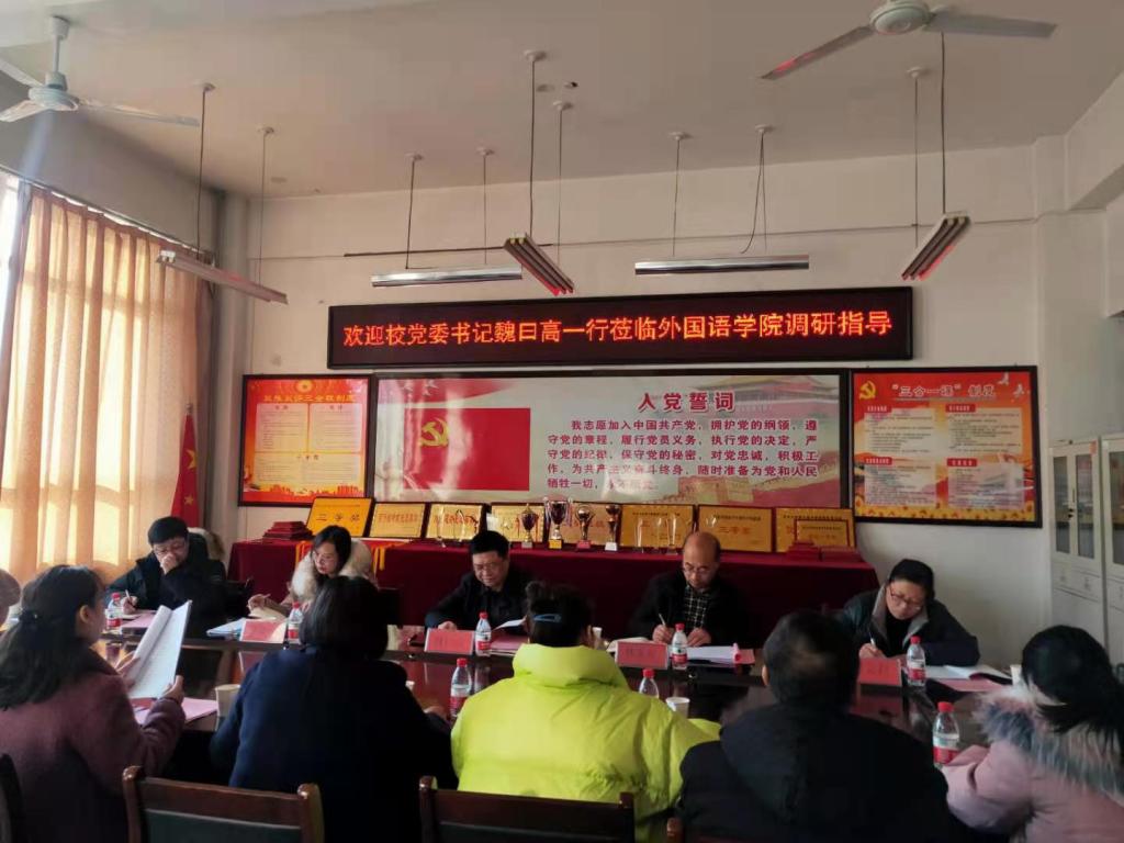 12月21日下午,校黨委書記魏曰高一行蒞臨外國語學院,對基層黨支部、教研室作用發揮及教師轉型發展進行調研。外國語學院領導班子成員、各教研室主任及優秀教師代表列席會議。
