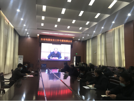 2022年1月27日,全省校園安全工作專題視頻會議召開。校長霍曉麗、副校長吳玉倫,各部門、各學院主要負責人在行政樓201會議室集中收看。