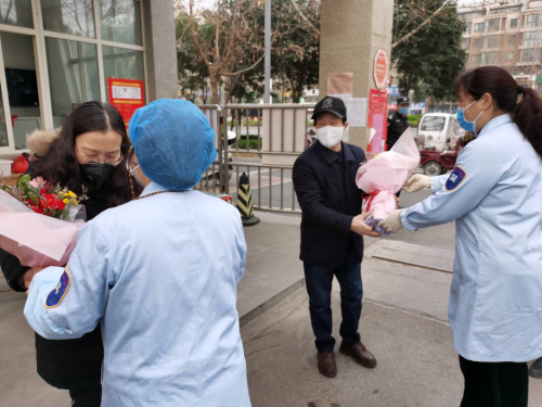 窗外已經是姹紫嫣紅的時節,易先生夫婦二人也按照確診病例治愈后隔離14天后解除。讓他們更加開心的是,迎接他們回家的焦作大學副校長吳玉倫,山陽區新城街道辦事處副書記康少宇、副主任鄭麗娟和人民路社區醫院院長王玉濤等在家門口等待了不少時間。